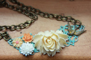 Rowan (a faux patina filigree hair clip with repurposed vintage costume jewelry); Beatrix (a filigree adjustable ring with a locket that opens and a darling cabochon); Zora (a filigree adjustable ring with repurposed vintage costume jewelry);